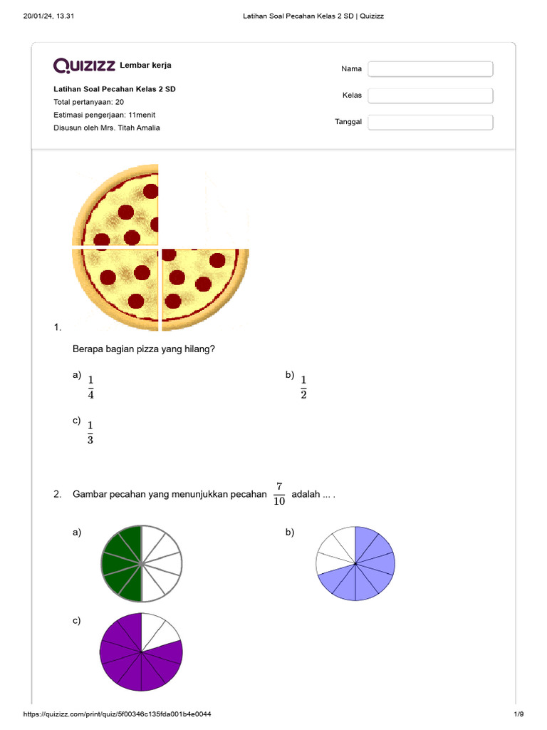- Soal 2: Jika sebuah pizza dibagi menjadi empat bagian yang sama besar, dan kamu makan satu bagian, kamu makan berapa pecahan dari pizza? (Jawaban: 1/4)